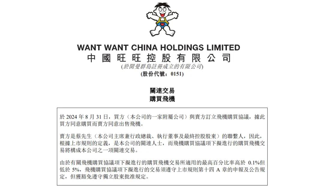 9月初,中国旺旺披露一项关联交易称,附属公司天津祥旺咨询,向集团主席蔡衍明控股的Planet Media Limited,购买一架空中巴士A318-112商务机。