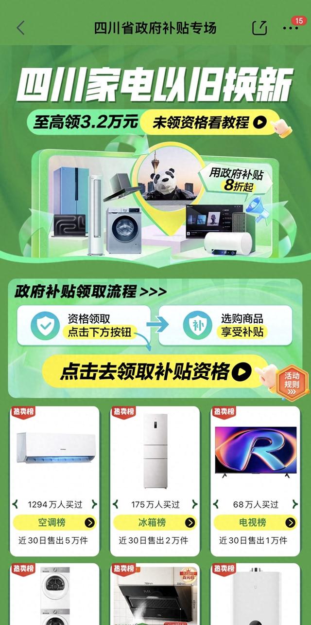 如今的“支付环节立减”模式则更为便捷。9月14日晚,京东上线四川以旧换新活动专场,消费者在京东买家电以旧换新或是直接购新均可使用补贴。